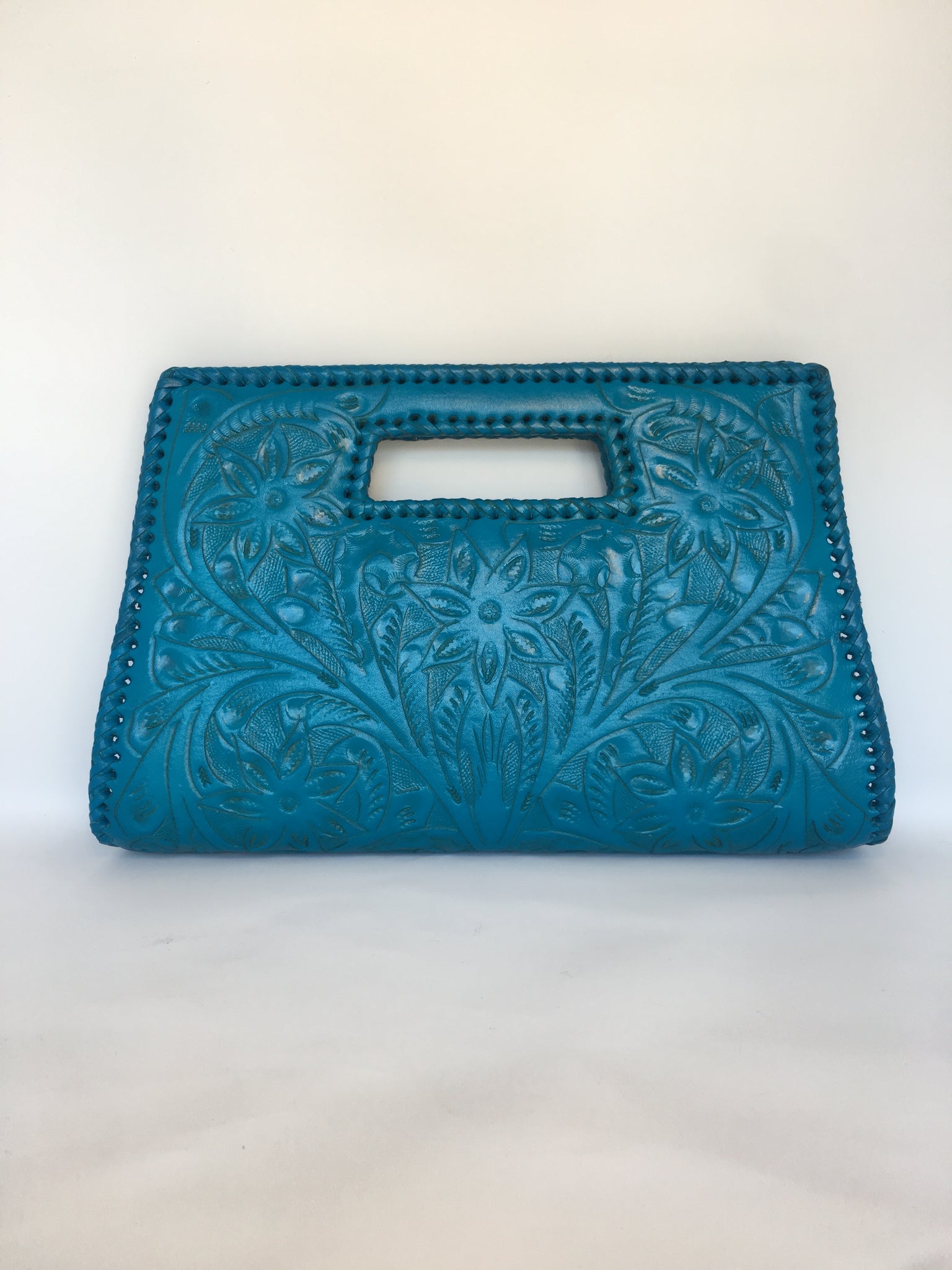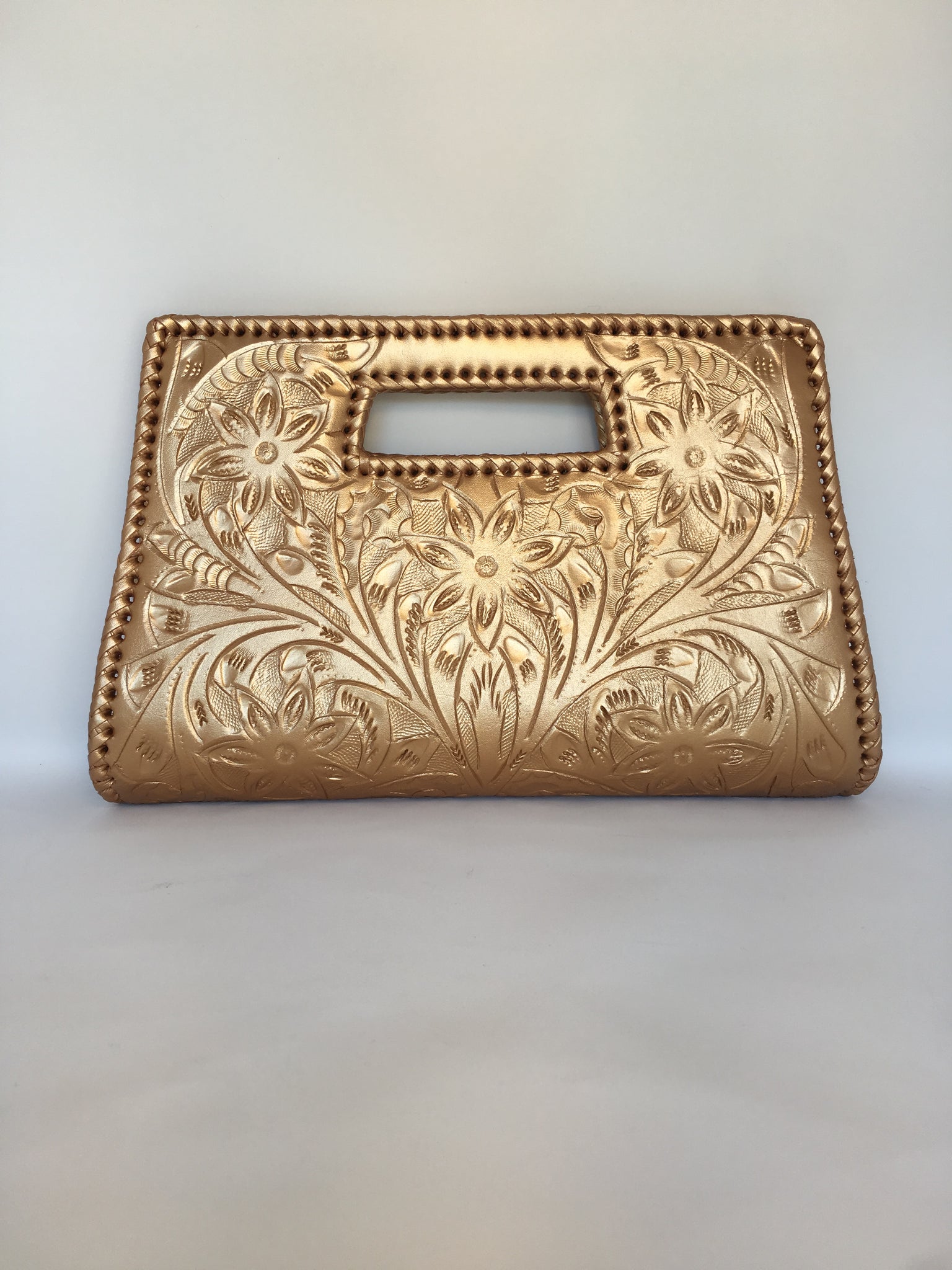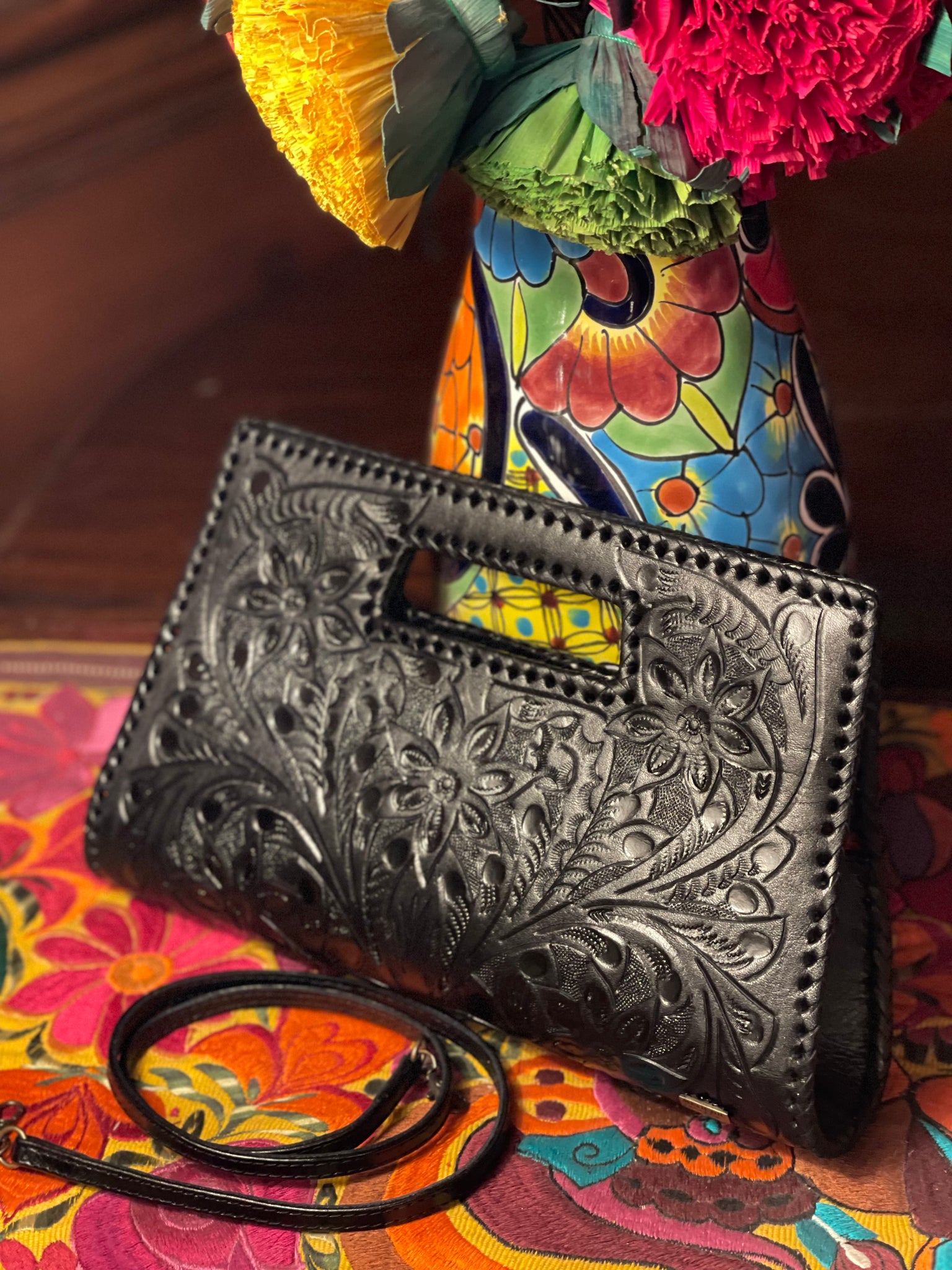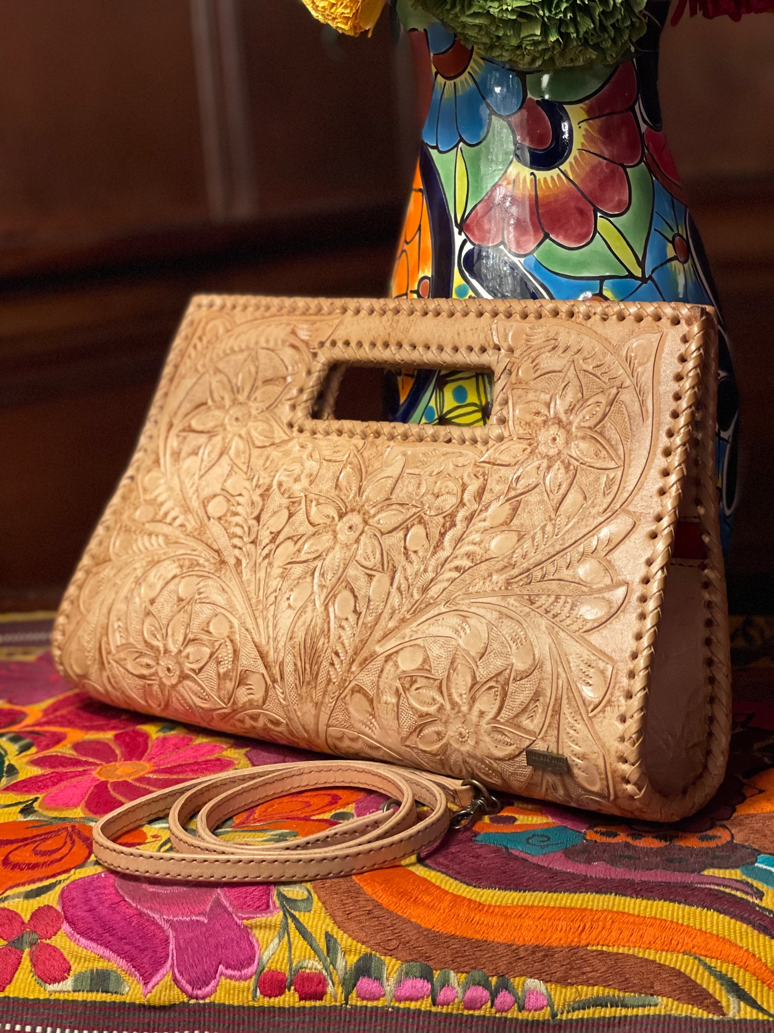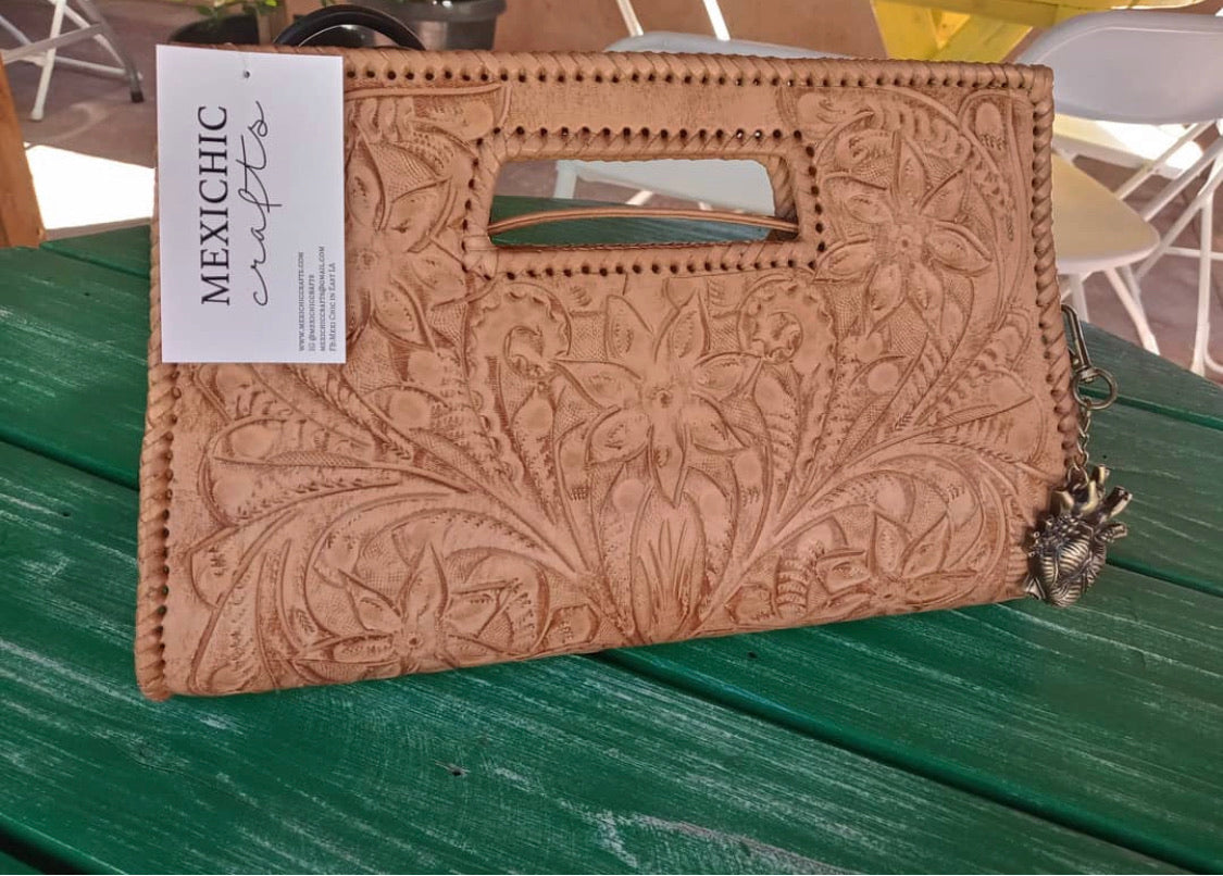 GLORIA is beautiful! Exquisitely crafted hand-tooled leather clutch with removable shoulder strap. Inside lined with suede leather.