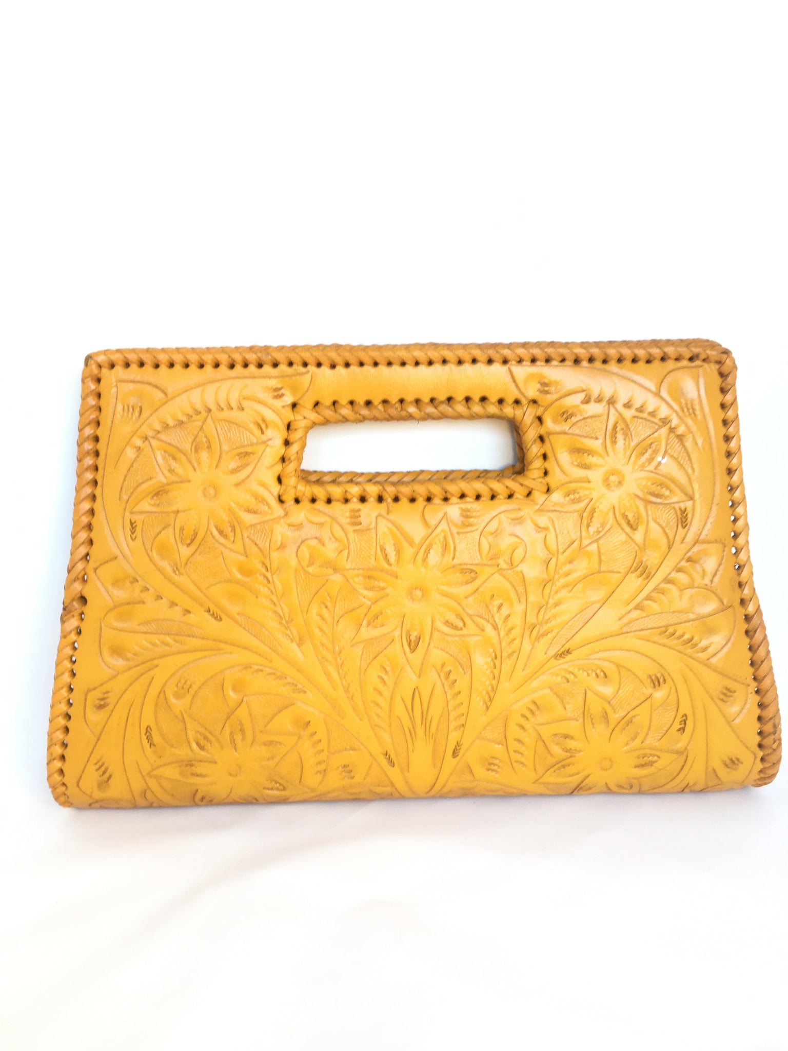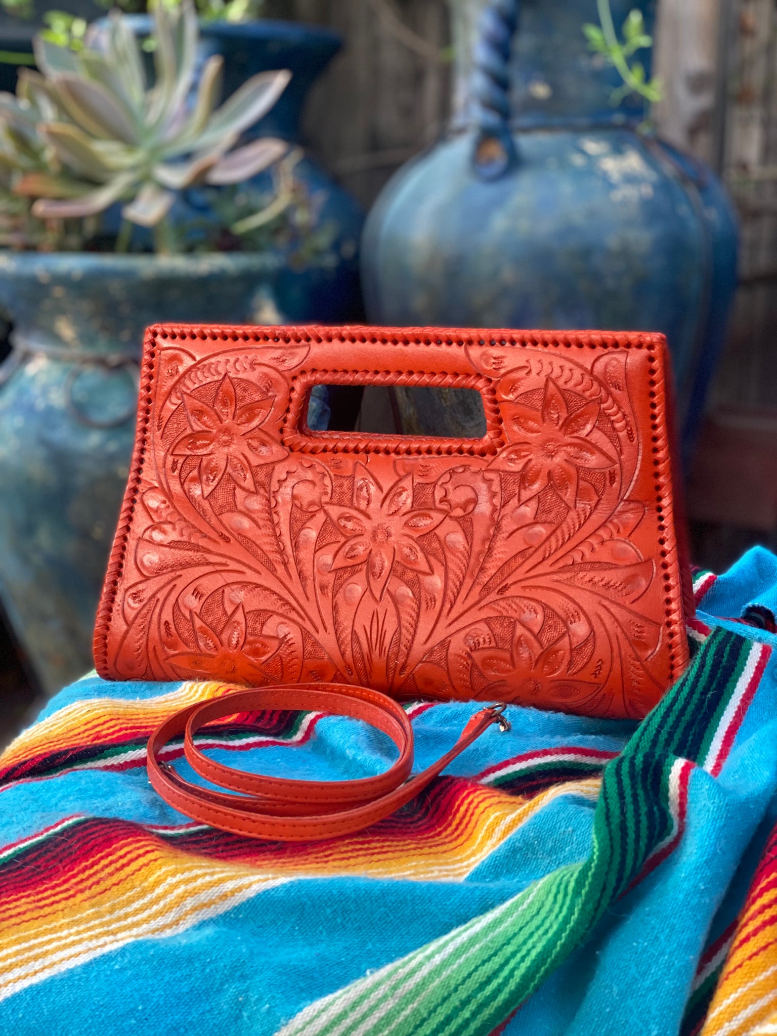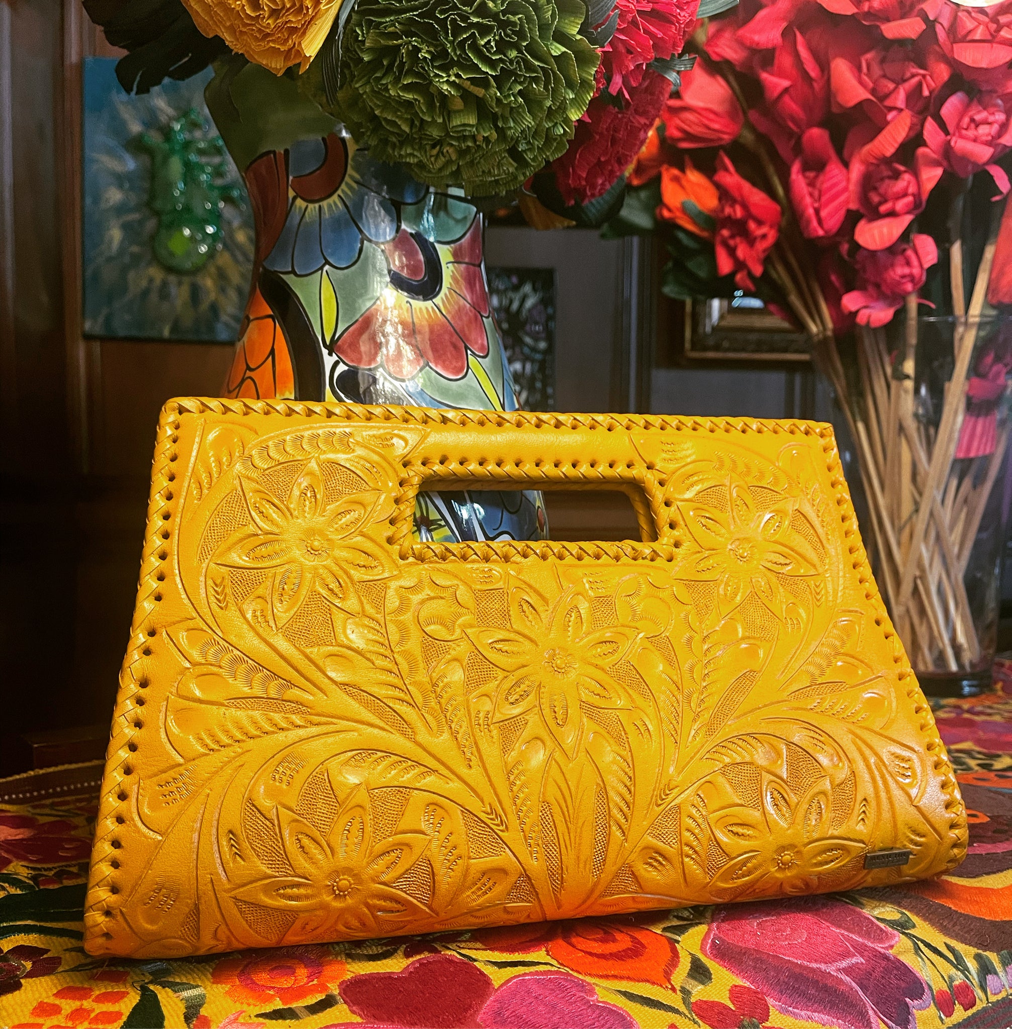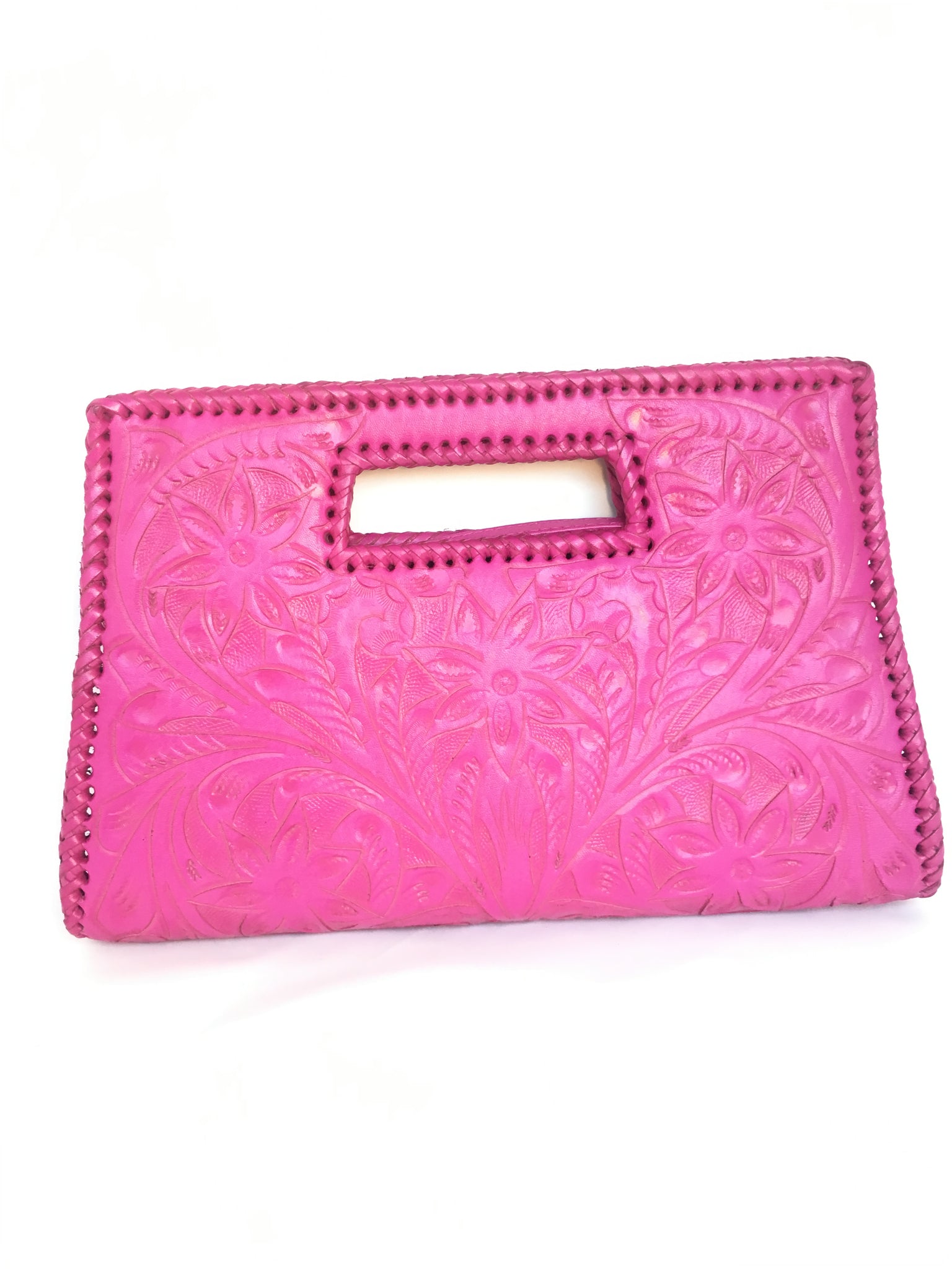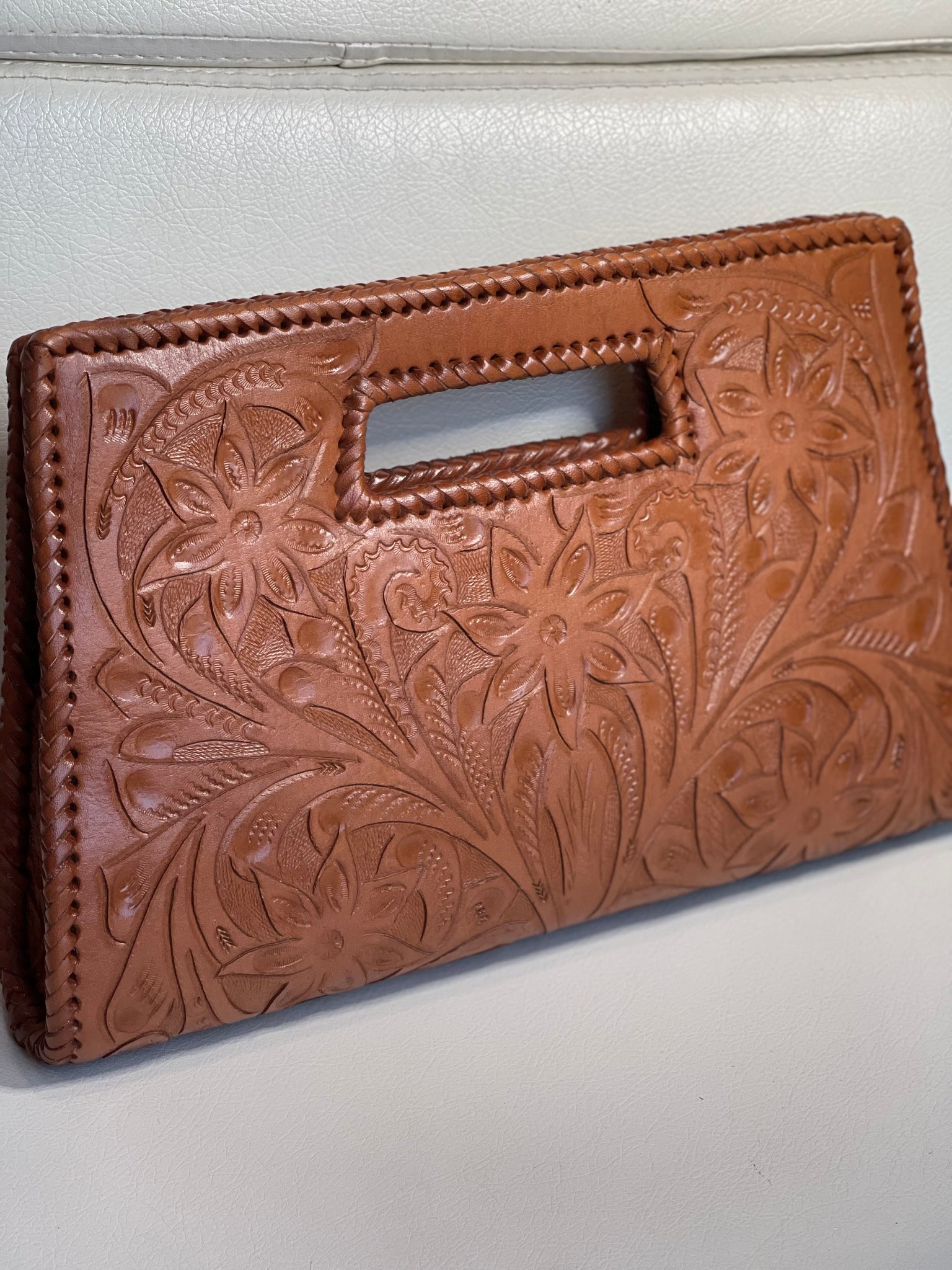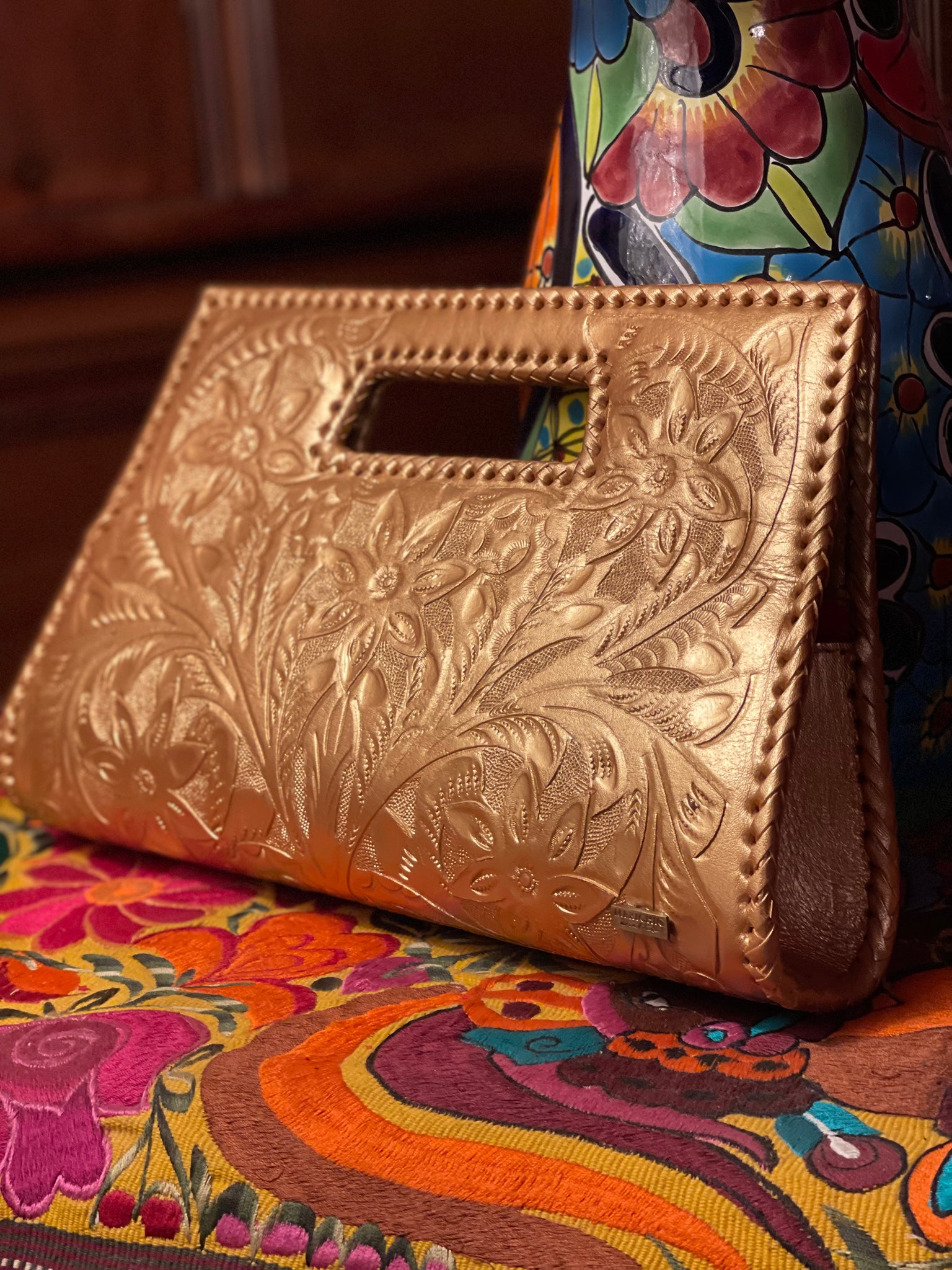 GLORIA is beautiful! Exquisitely crafted hand-tooled leather clutch with removable shoulder strap. Inside lined with suede leather.