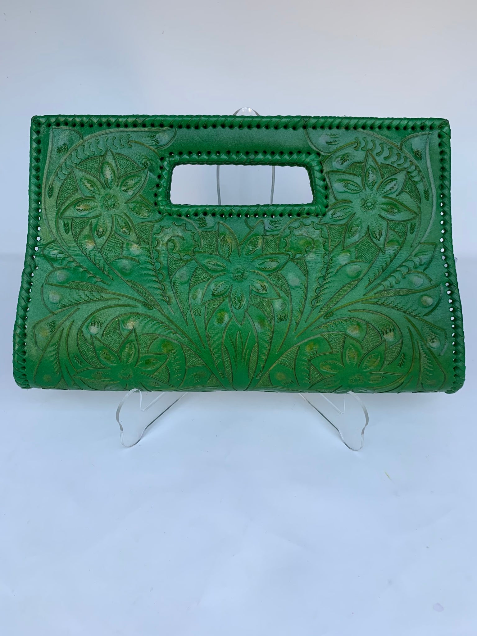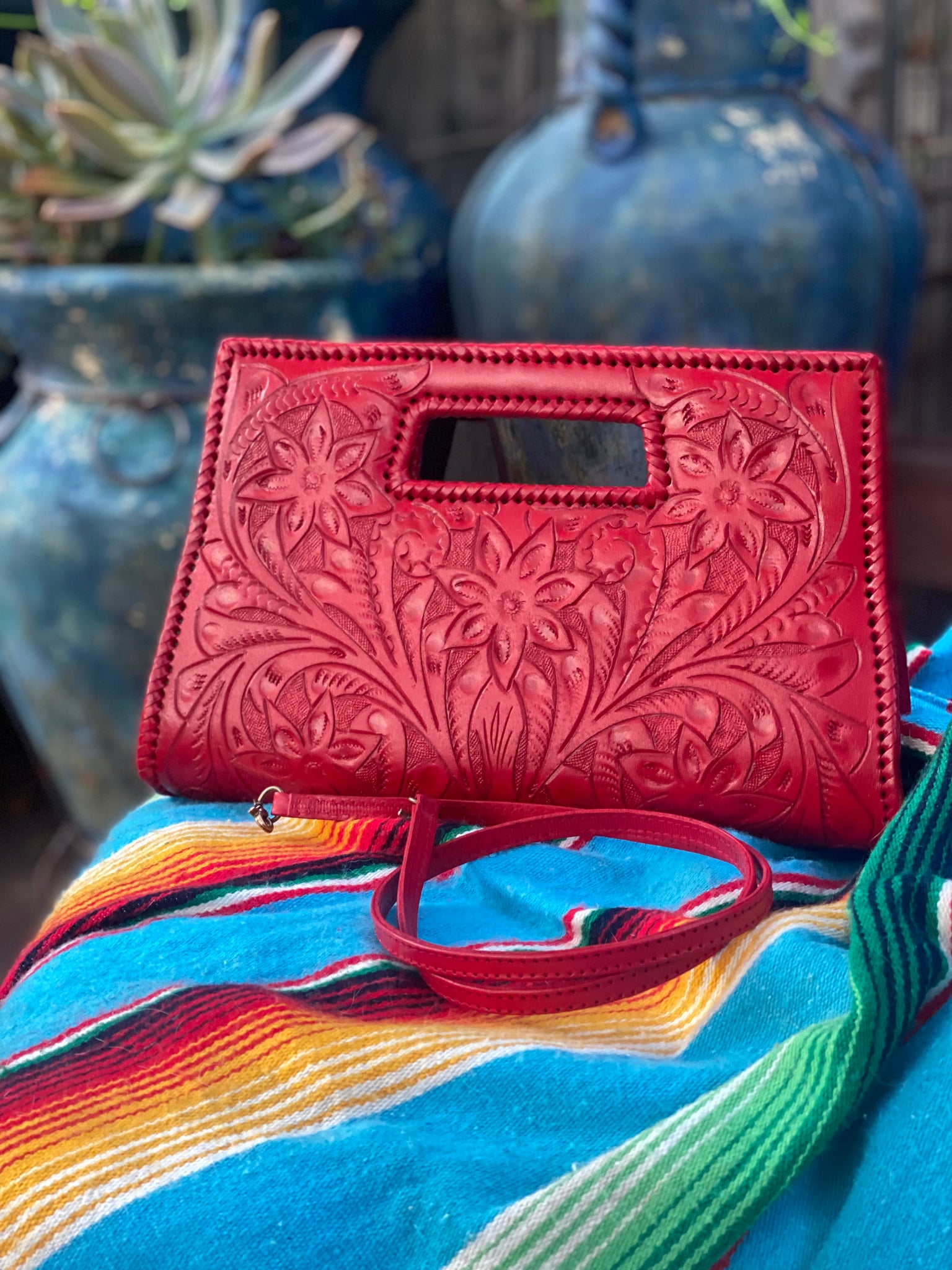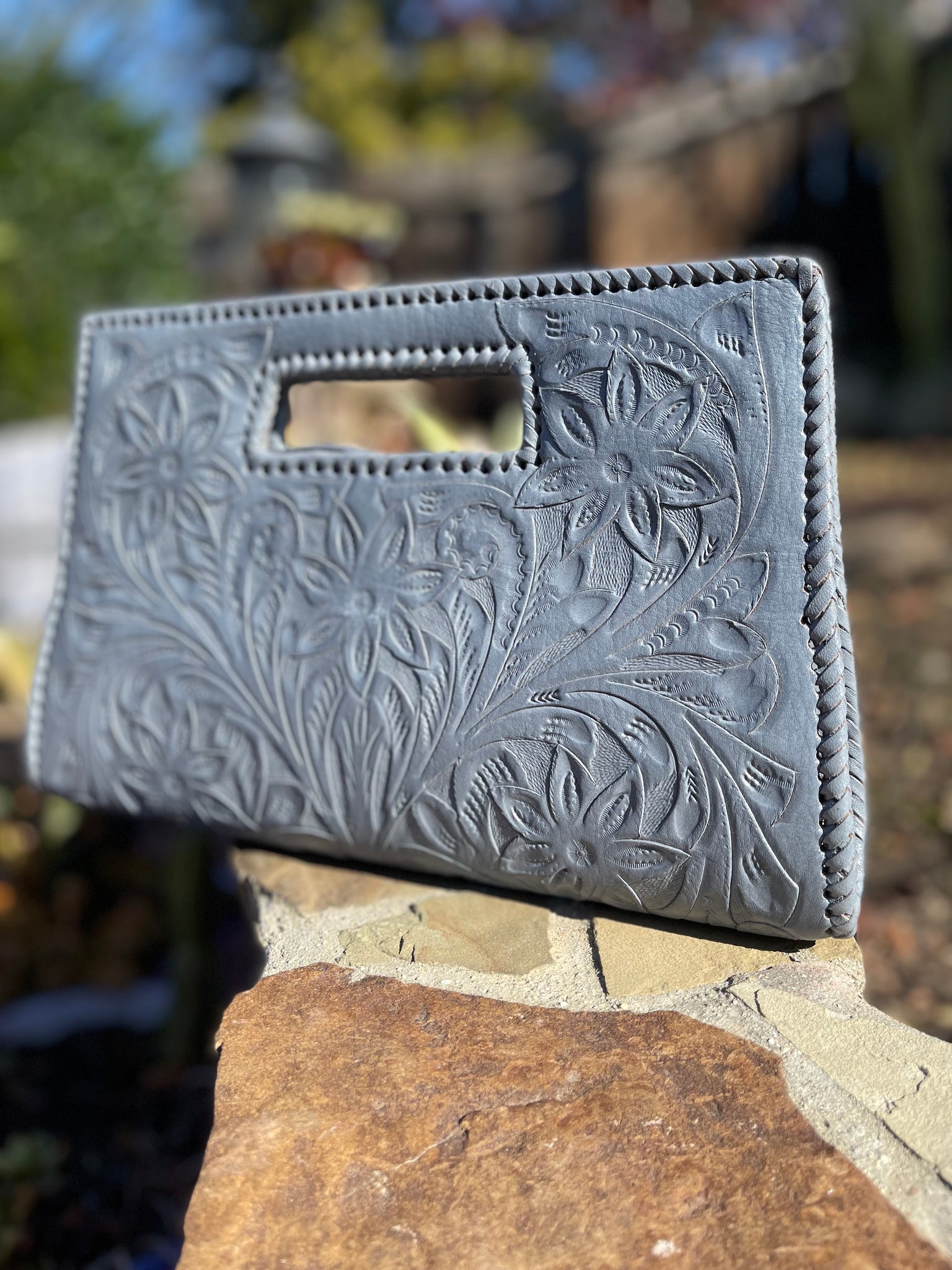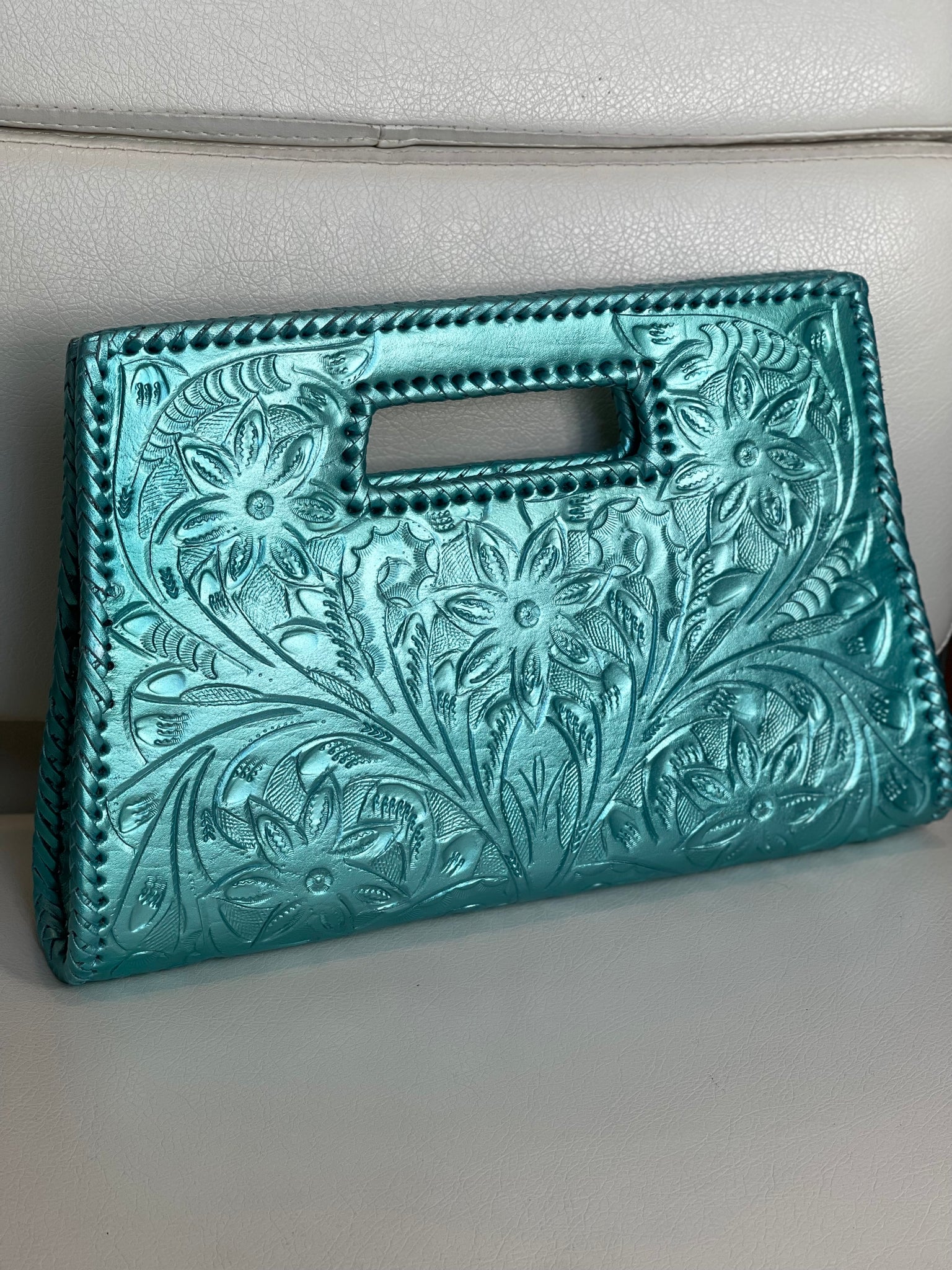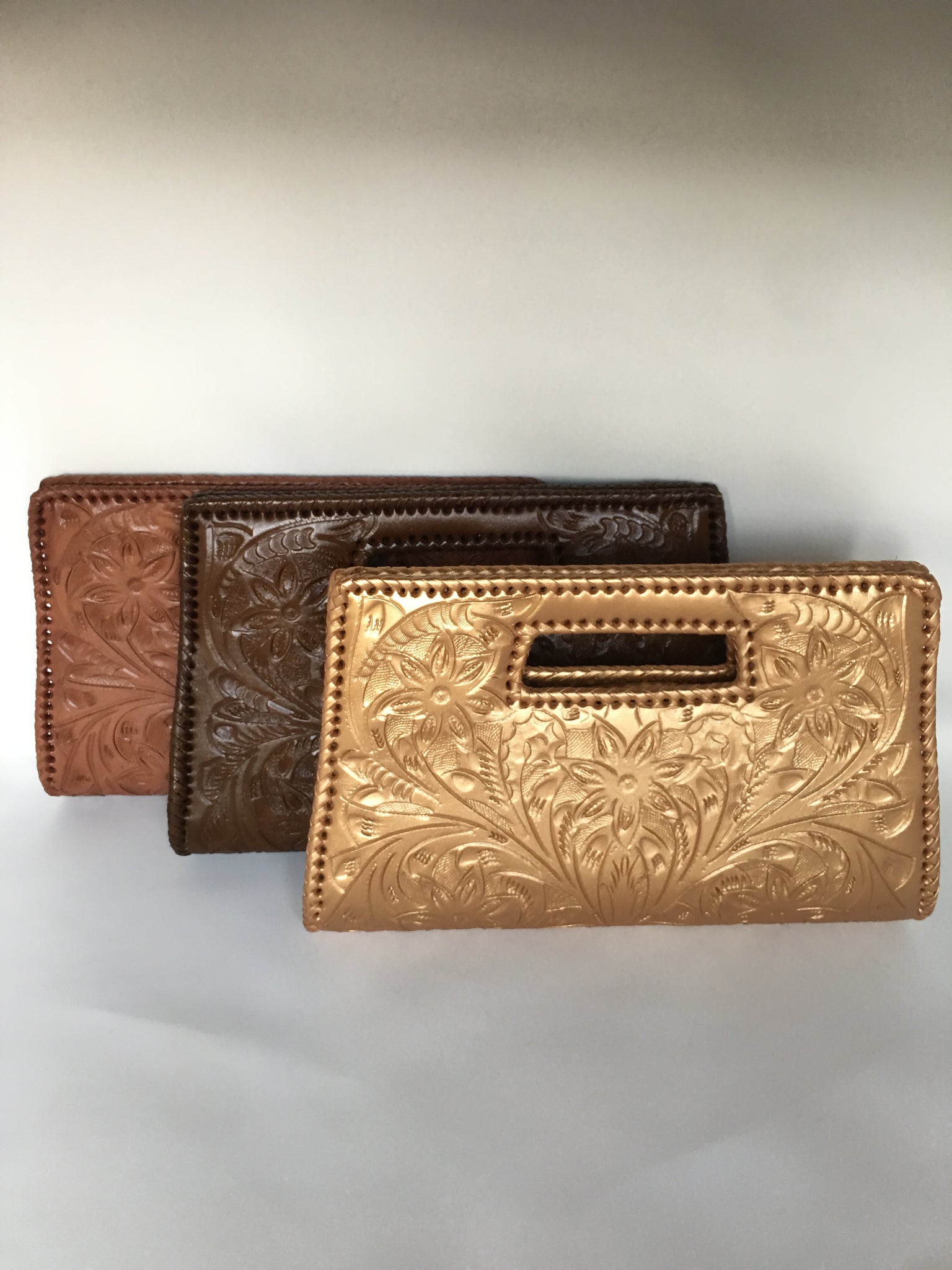 GLORIA is beautiful! Exquisitely crafted hand-tooled leather clutch with removable shoulder strap. Inside lined with suede leather.