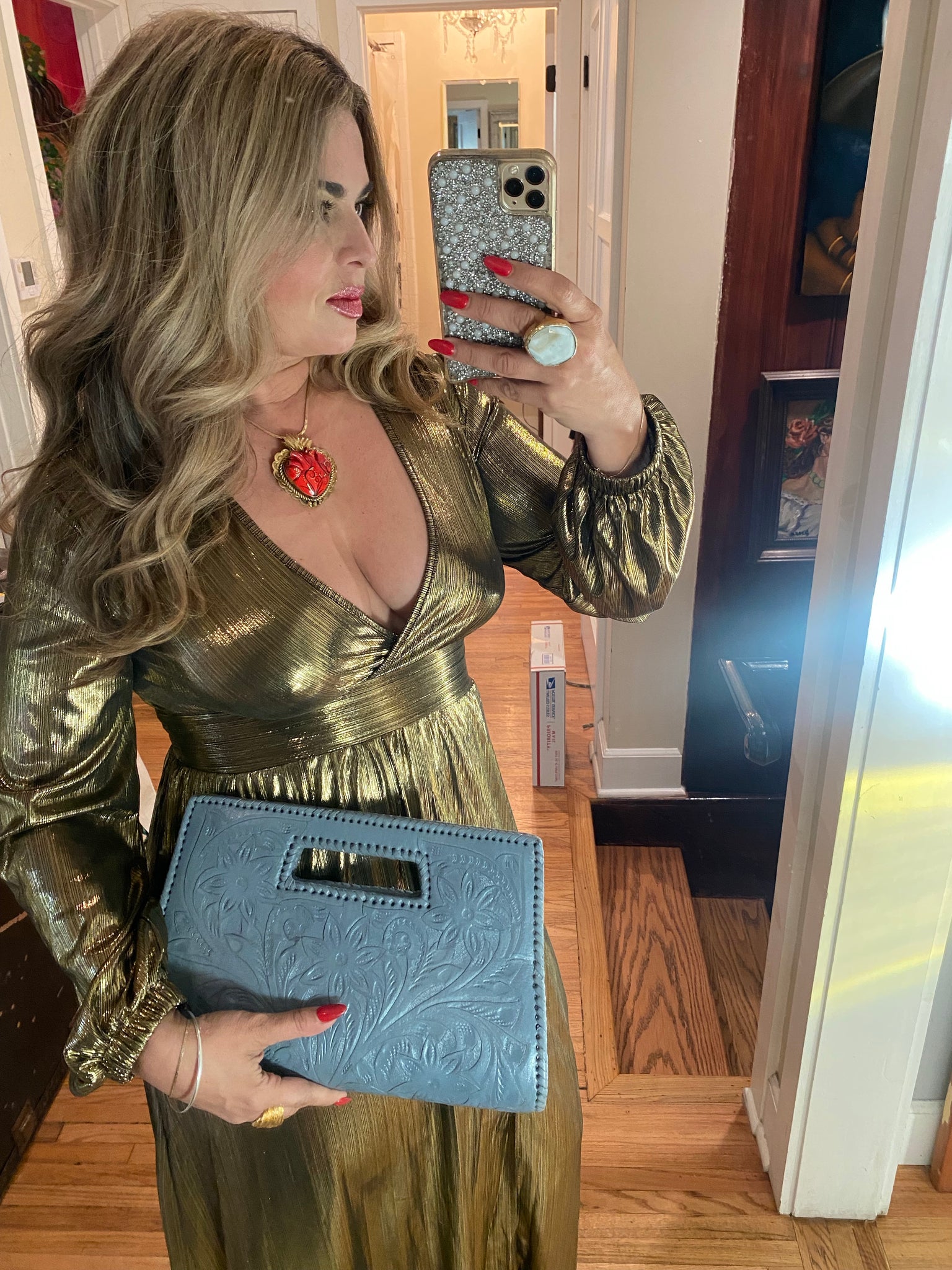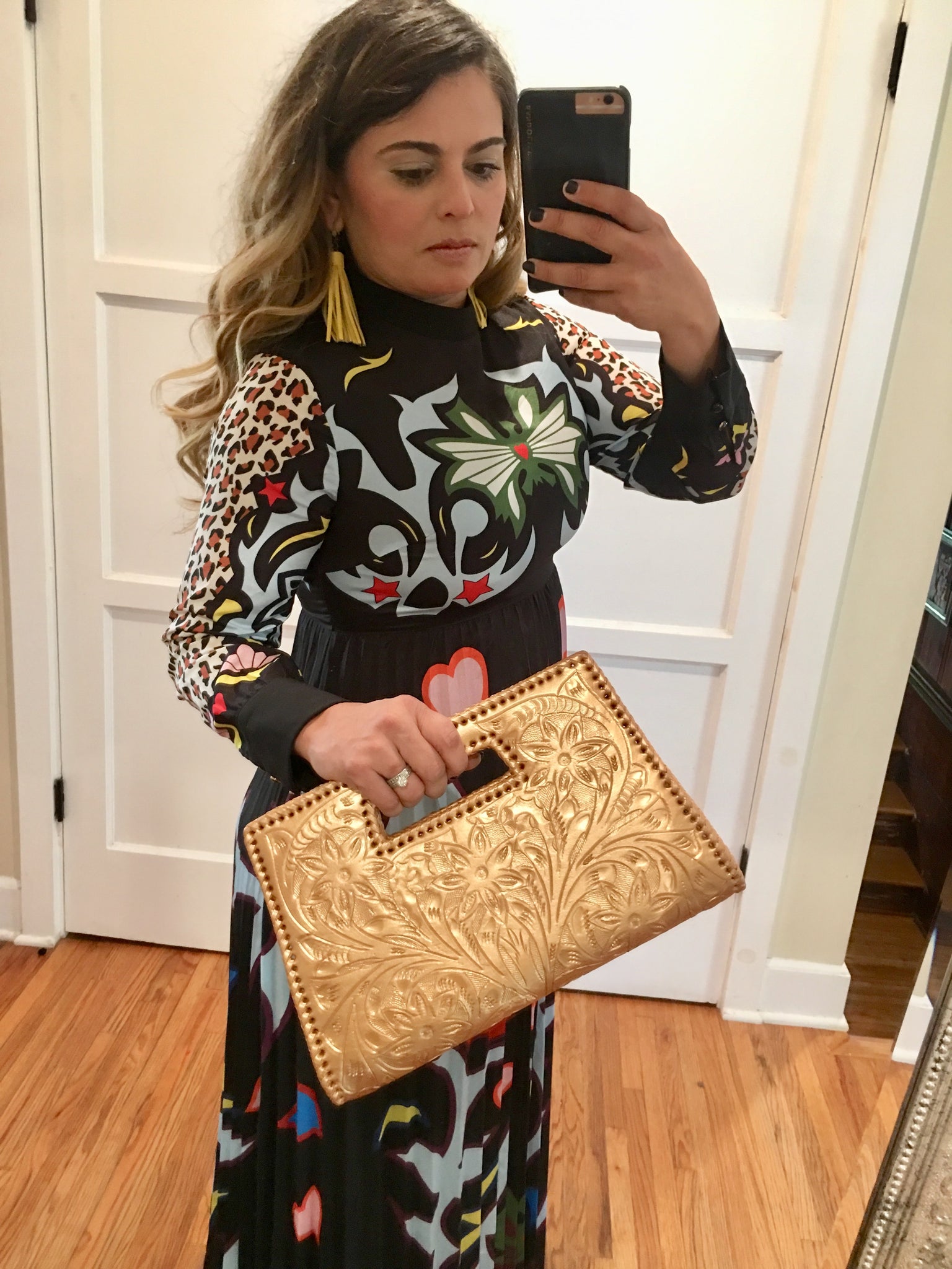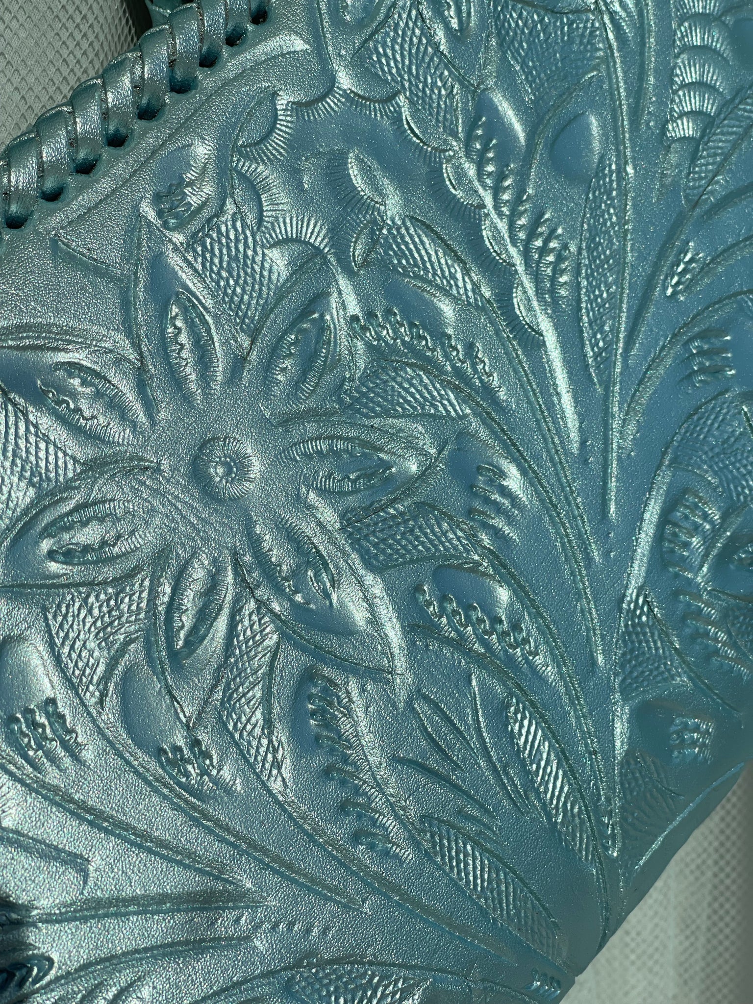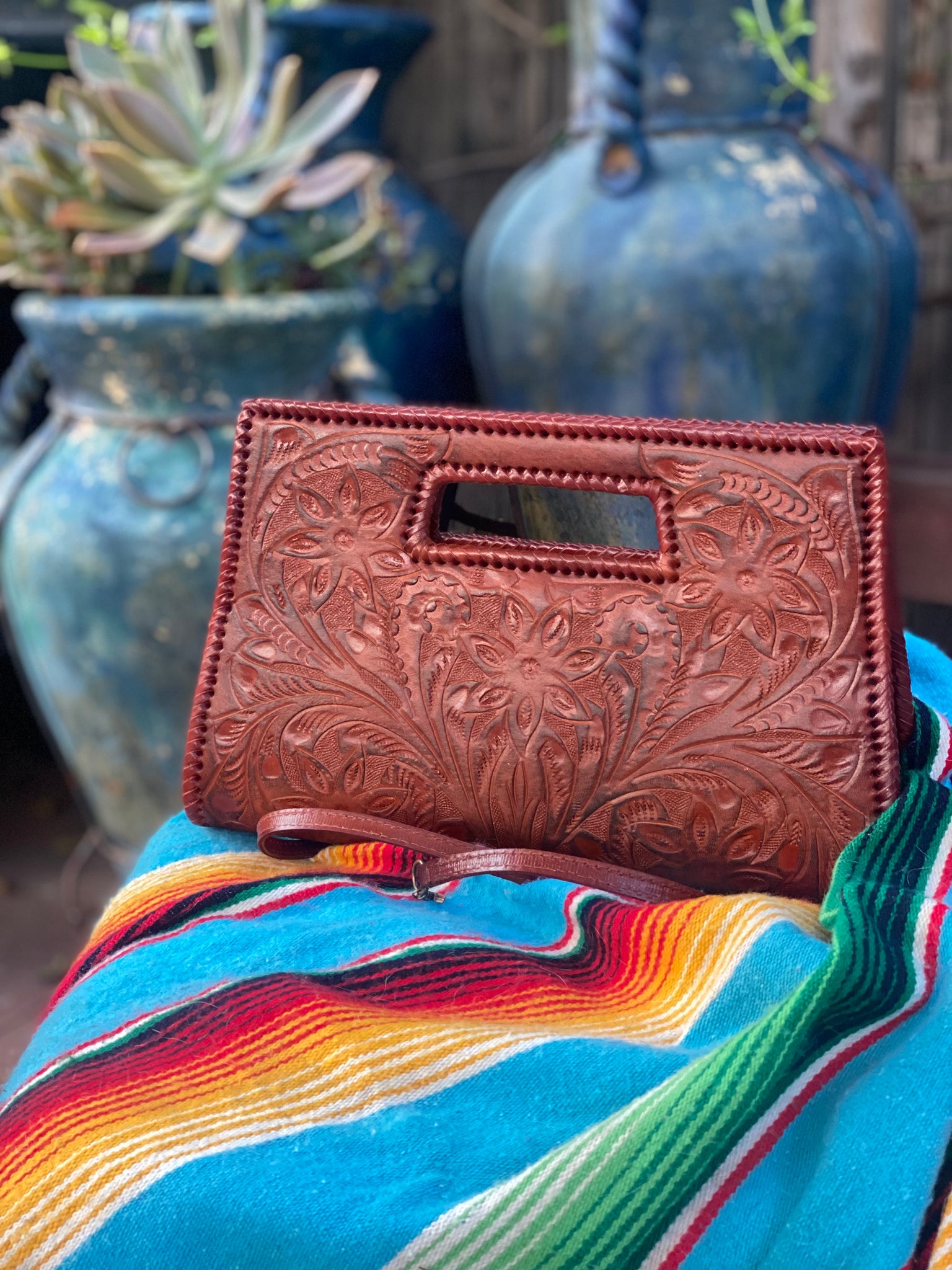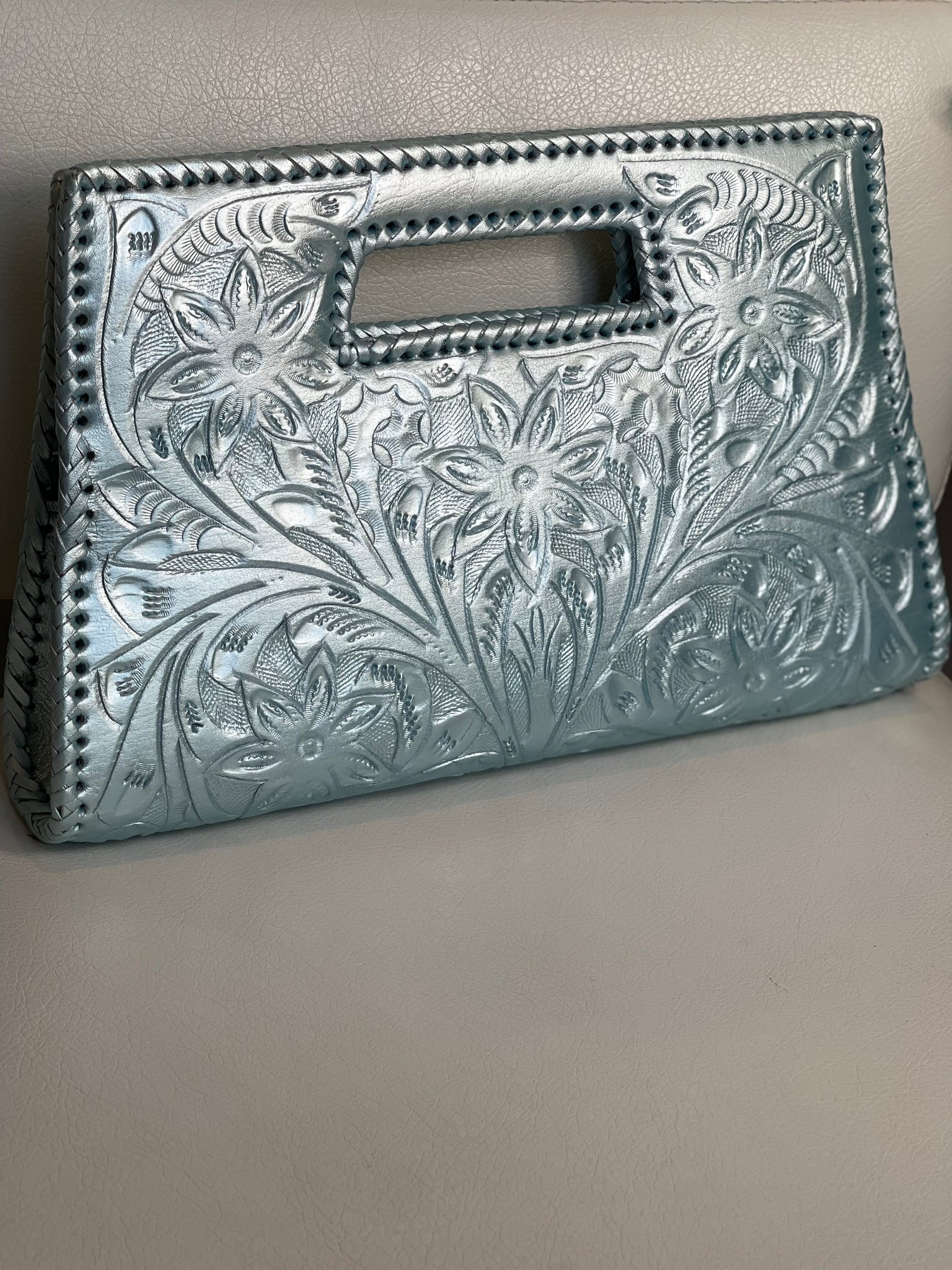 GLORIA is beautiful! Exquisitely crafted hand-tooled leather clutch with removable shoulder strap. Inside lined with suede leather.