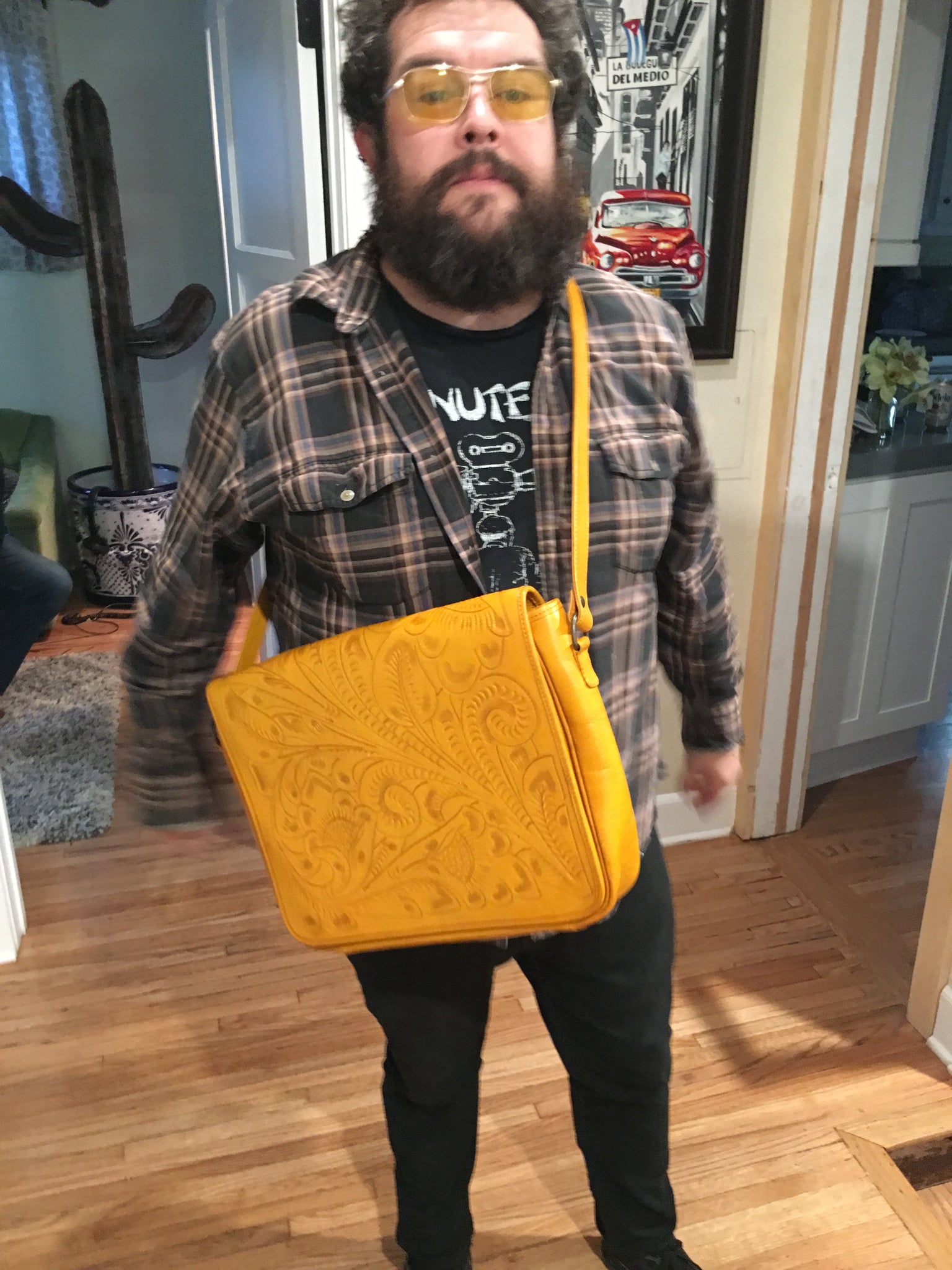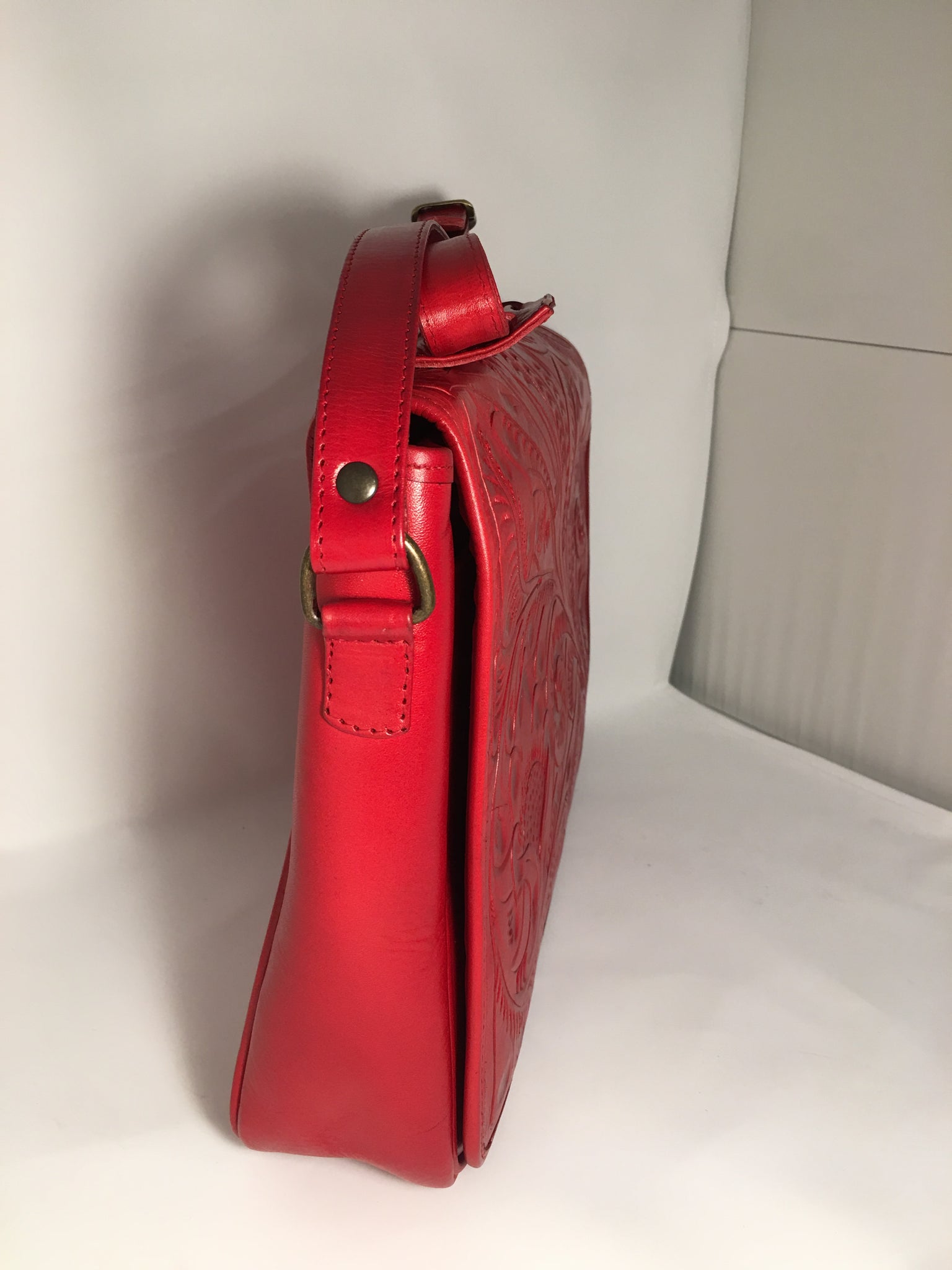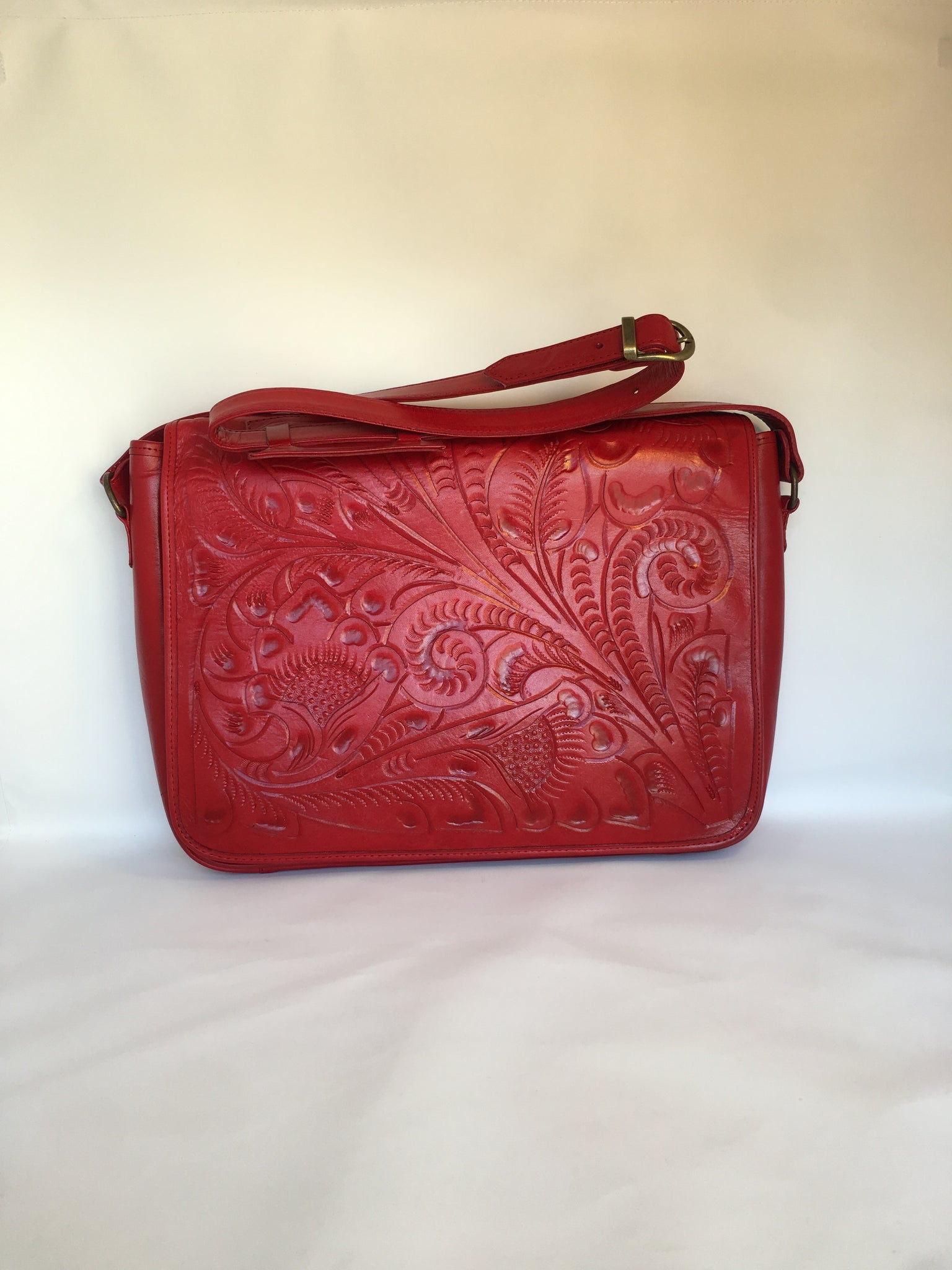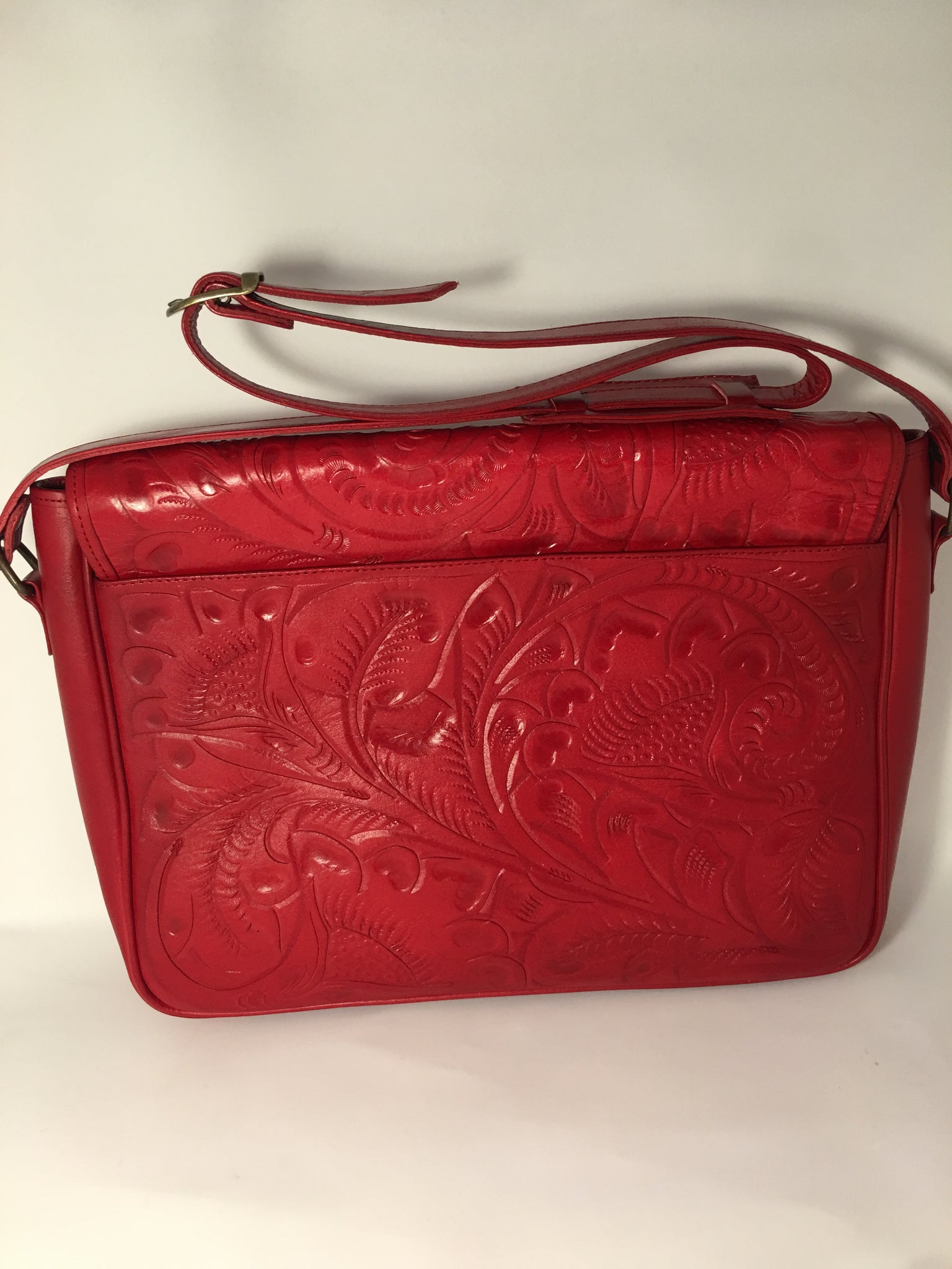 FERNANDA is amazing! Exquisitely crafted hand-tooled leather satchel with adjustable strap. Fits laptop, textbooks and files perfectly. Inside lined with suede leather.